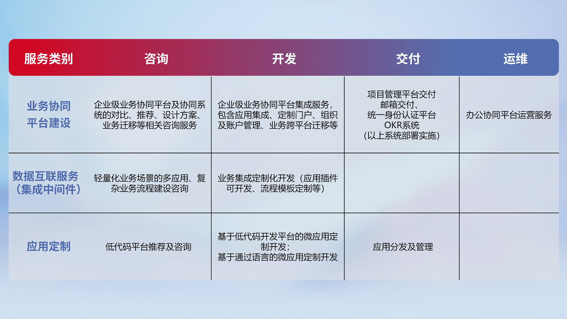 针对钉钉、、、企微、、、IDaas等平台级产品提供产品的规划、、、方案、、交付、、、定制化开发等服务,,实现如统一协同办公、、智能客户服务、、、、混合会议管理、、、智能数据查询、、等业务场景,,,,实现数字化转型。。